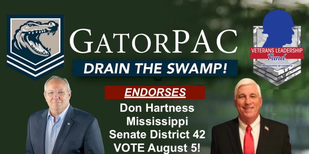 Retired U.S. Air Force Colonel Rob Maness, a 32-year combat veteran, Chairman of GatorPAC and its Veterans Leadership Fund, today announced his strong endorsement of Don Hartness in the Republican primary for Mississippi State Senate District 42. The special primary election is scheduled for August 5, 2025.” As a lifelong servant to our nation and a staunch advocate for America First principles, I am proud to endorse Don Hartness, a true conservative leader who has dedicated his life to supporting veterans and upholding Mississippi values,” said Colonel Maness. “Don’s experience as the former president of a non-profit veterans organization demonstrates his unwavering commitment to those who have served our country. In the Mississippi State Senate, he will fight to represent his constituents, promote economic growth, protect Second Amendment rights, and defend the sanctity of life. Mississippi needs principled conservatives like Don Hartness to stand against the politically connected and deliver real results for families, veterans, and hardworking citizens. “Hartness, a graduate of Mississippi State University with a degree in Business Administration, is a devoted family man married to Jerrie with four children. A member of West Ellisville Baptist Church, he brings a strong foundation of faith and community service to his campaign. His platform emphasizes conservative priorities, including fiscal responsibility, support for law enforcement, and policies that empower Mississippi’s economy while honoring the sacrifices of veterans. GatorPAC and the Veterans Leadership Fund have a proven track record of endorsing America First candidates who prioritize veterans’ issues and constitutional liberties. This endorsement underscores Hartness’s alignment with these core values in a critical race against the incumbent that doesn’t listen to the community. Voters in District 42, which includes parts of Jones and Wayne counties, are encouraged to support Don Hartness on August 5 to send a strong conservative voice to Jackson. GatorPAC is a political action committee dedicated to electing America First and veteran candidates who will drain the swamp and restore constitutional governance. The Veterans Leadership Fund, a key initiative of GatorPAC, focuses on supporting leaders who advocate for veterans’ rights and national security.